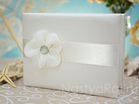 Изящная книга пожеланий с нежным многослойным цветком со сверкающей серединкой идеально подойдет для свадебной церемонии на пляже. Цвет основы или цветка может быть любой на выбор.