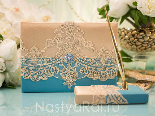 Альбом для пожеланий в восточном стиле, декорирован золотым кружевом и яркой брошкой.