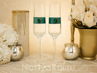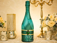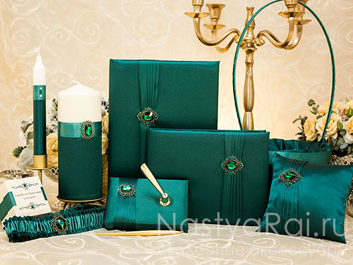 Свадебная коробка оформленная изумрудным атласом и брошью из страз с декоративным изумрудом.