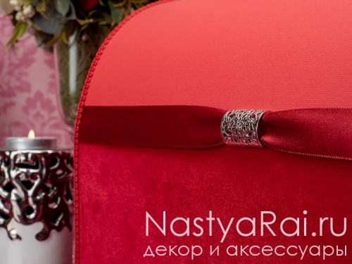 Свадебная казна для денежных подарков из коллекции "Рубин" оформлена бархатом, атласными лентами и логотипом молодоженов.