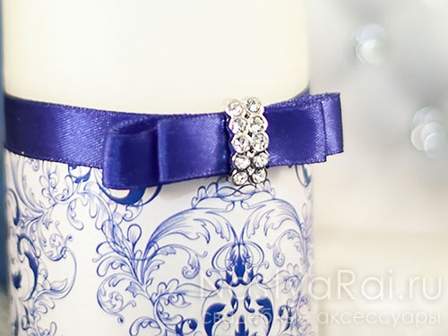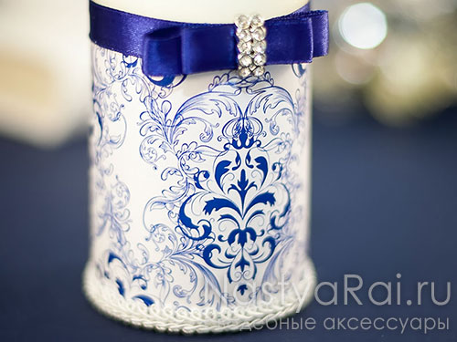 Набор свечей для свадебной церемонии с синим орнаментом. Свеча-очаг декорирована атласной лентой, двойным бантом и брошью из страз. Родительские свечи в подсвечниках декорированы декоративной тесьмой и стразами.