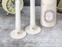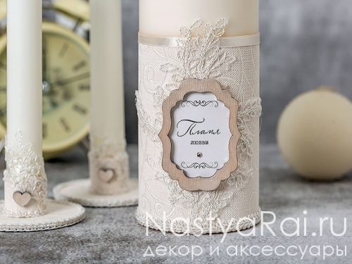 Набор свадебных свечей - коллекция "Мелодия любви" выполнен в классических светлых тонах. В набор входят три свечи - одна большая и две узкие. Все три аксессуара выполнены в одном стиле: декор выполнен из дизайнерской бумаги цвета айвори, кружева и белой тесьмы. Две узкие свечи украшены маленькими сердечками из дерева, а большая - фигурной рамкой, внутри которой серебряная надпись "Пламя любви" и круглый кристалл Сваровски.