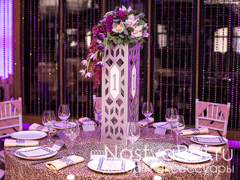 Оформление гостевого стола было разработано и воплощено нашими дизайнерами специально для «Семинара невест», организованного агентством “Wedding Way”. Посетительниц ждало множество сюрпризов, подарков, разнообразный интерактив и конечно море полезной информации. Наши дизайнеры и флористы рассказали невестам о свадебных трендах 2015 года, два из которых мы воплотили в нашей свадебной инсталляции. Оттолкнувшись от стильного геометрического дизайна потолка, мы использовали похожий паттерн в необычной резной подставке для цветов, а также повторили его в полиграфии и в декоре стульев. Модная в будущем сезоне геометрия как нельзя лучше сочетается с еще одной популярной темой, — гламур и роскошь 20-х годов, вдохновленные красочной лентой «Великий Гэтсби», не сдают позиций с прошлого сезона. Этот стиль подчеркнули искрящаяся пайетками скатерть и сверкающий дождь из кристаллов. Фотографии декора любезно предоставлены свадебным фотографом Дмитрием Питерским.