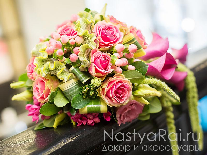 Букет невесты из розы кустовой, калл, гиперикума, амаранта.
