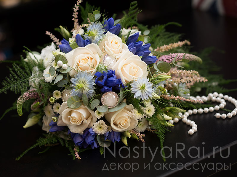 Букет невесты из розы, нигеллы и гентианы с бусинками и брошками.