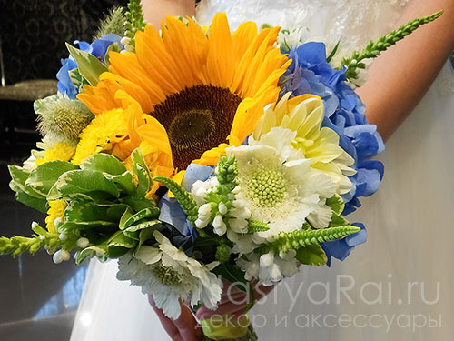 Букет из подсолнуха, георгин, хризантем, скабиозы, гортензии.