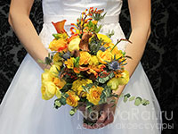 Букет состоит из розы, каллы, орнитогалума, эрингиума и эвкалипта.