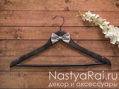 Свадебная вешалка для костюма жениха. Выполнена из дерева, окрашена в стильный черный цвет с напылением серебра. Украшена атласной бабочкой серого цвета.