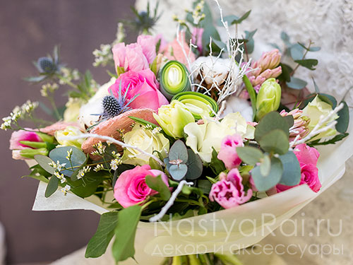 Состав: роза, годеция, тюльпаны, хлопок, эрингиум, гиацинты, зелень.