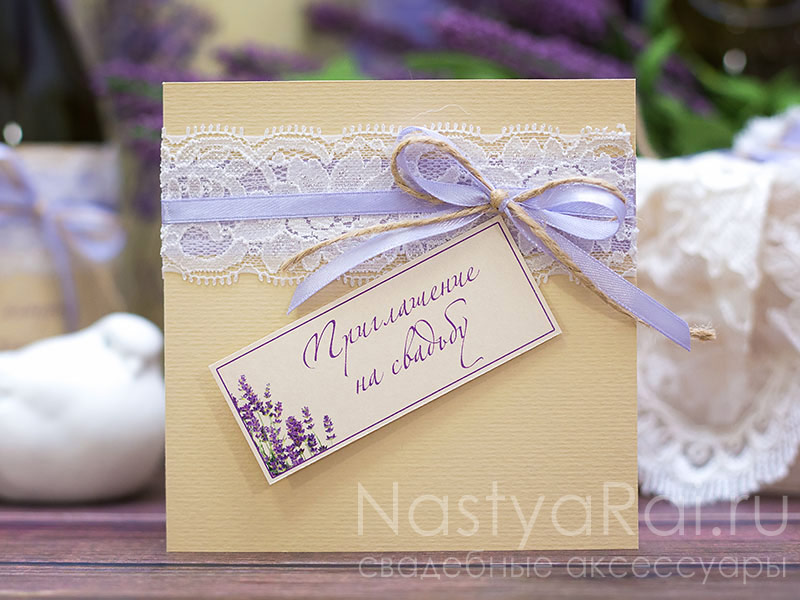 Приглашение украшено кружевом лентами и бантиком с карточкой