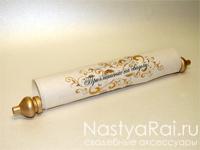 Особенно эффектно смотрится нанесение текста золотым или серебряным текстом. Свернутый свиток дополнительно украшен намоткой из тонкой капроновой ленточки.