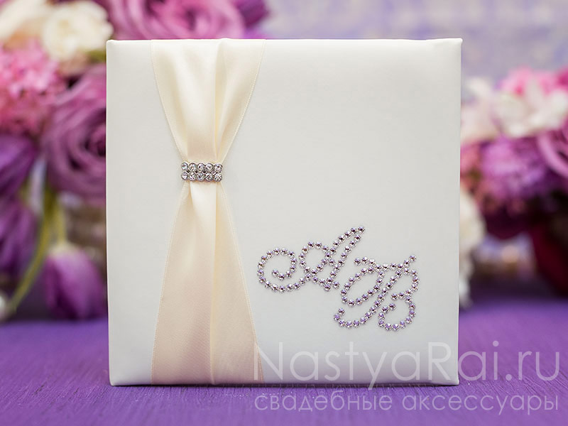 Приглашение изготовлено из плотного 2мм картона, который обтянут атласом. Лицевую сторону украшают переплетенные инициалы из страз Сваровски и атласная лента с брошью.