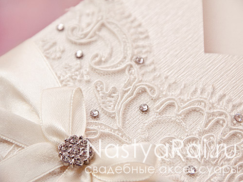 Изысканное пригласительное на свадьбу украшенное итальянским кружевом, стразами, атласным бантом и цветком из страз.