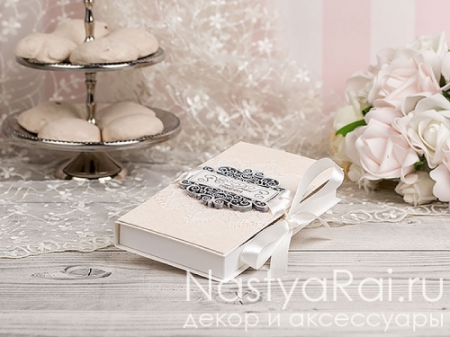 Коробочка для денег "Шарлиз" изготовлена из плотного картона. Крышка украшена дизайнерской бумагой с рельефной текстурой цвета слоновой кости. Основным элементом декора является резная табличка из натурального дерева с надписью "С днем свадьбы"на тонком гипюре. Завязывается на атласную ленту в тон. Внутри фигурный держатель для денег из бумаги. В коробочку поместятся купюры любого достоинства.