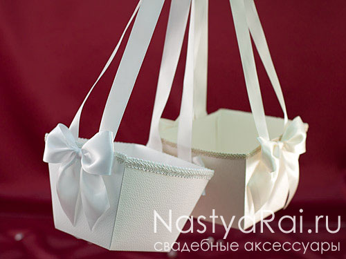 Свадебная корзинка из дизайнерской бумаги, украшена атласными лентами и тесьмой.