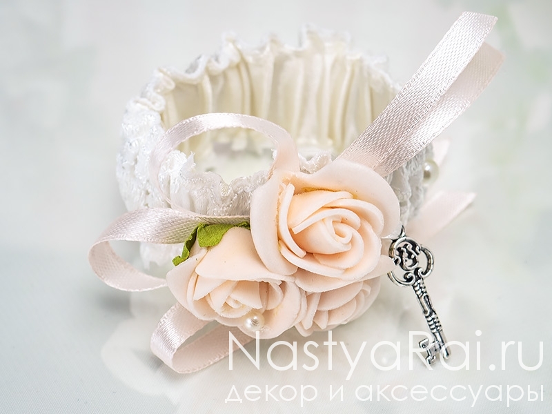 Браслет на резинке, из молочной атласной ленты, декорировано композицией из розовых роз и атласных лент. Нежное дополнения для образа подружки невесты на свадьбе.