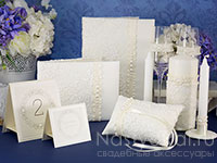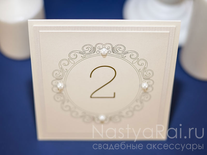 Карточка с номером стола из перламутрового кремового дизайнерского картона, с внутренней перегородкой для устойчивости. Декорирована жемчужными бусинами.