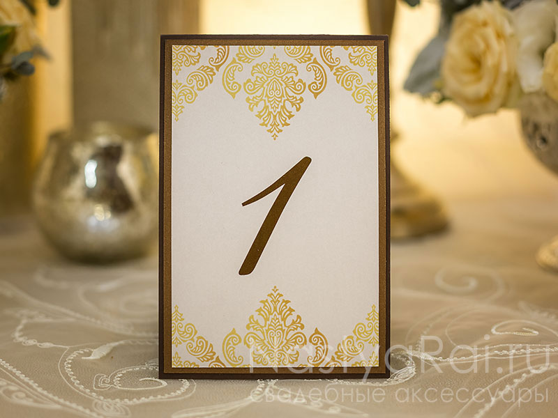 Номер стола из дизайнерского картона шоколадного цвета, цифра на перламутровой бумаге с золотистым орнаментом.