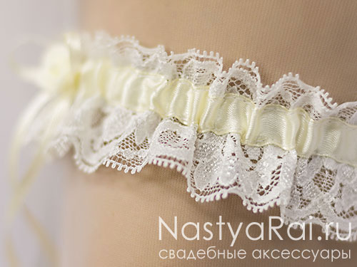 Подвязка из белого кружева с молочной атласной лентой, украшена атласным бантом и розочкой.