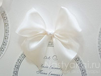 План рассадки гостей в белой раме, на фактурной дизайнерской бумаге с перламутровым блеском. Столики круглой формы, с серебряным фольгированием, декорированы атласными бантами и перламутровыми бусинами. Стол молодоженов (президиум) выделен самой крупной карточкой и декорирован россыпью перламутровых бусин.