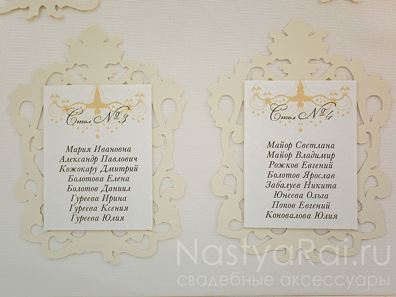 План рассадки гостей в деревянной раме, затонированной перламутровой краской, на кремовой дизайнерской бумаге с фактурным тиснением. Столики на изысканных резных подложках из кремовой дизайнерской бумаги, напечатаны на бумаге молочного цвета. Стол молодоженов (президиум) выделен самой крупной карточкой.