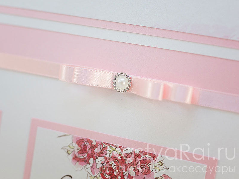 План рассадки гостей в белой раме, на белой и розовой дизайнерской бумаге с перламутровым блеском. Столики на цветных подложках, с акварельным цветочным узором напечатаны на карточках из дизайнерской бумаги. Стол молодоженов (президиум) выделен самой крупной карточкой и декорирован розовой атласной лентой и жемчужно-стразовой брошкой.