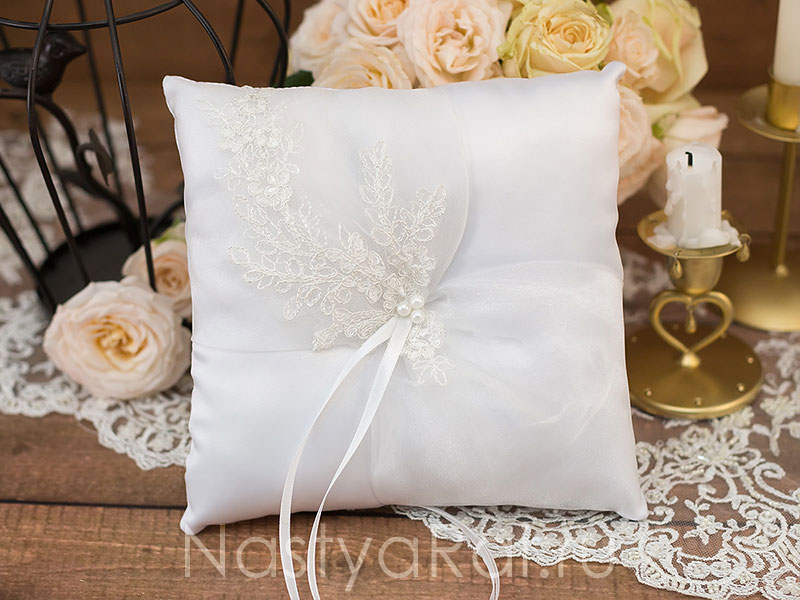 Классическая подушечка для обручальных колец из атласа и оргазы. Декорирована итальянским кружевом. Колечки можно закрепить на лентах.
