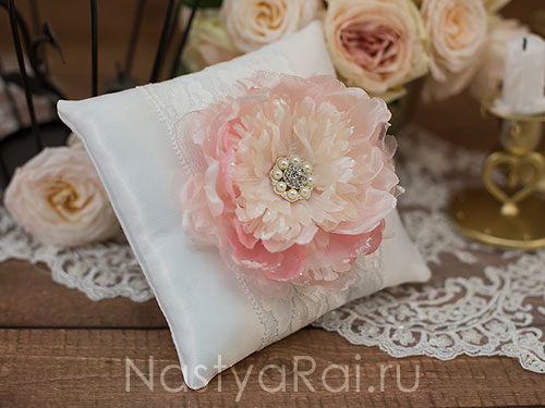 Нежная и изысканная свадебная подушечка для колец. Украшена крупным цветком, кружевом и брошкой.
