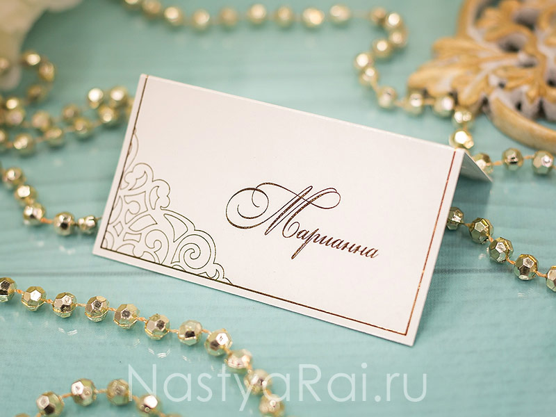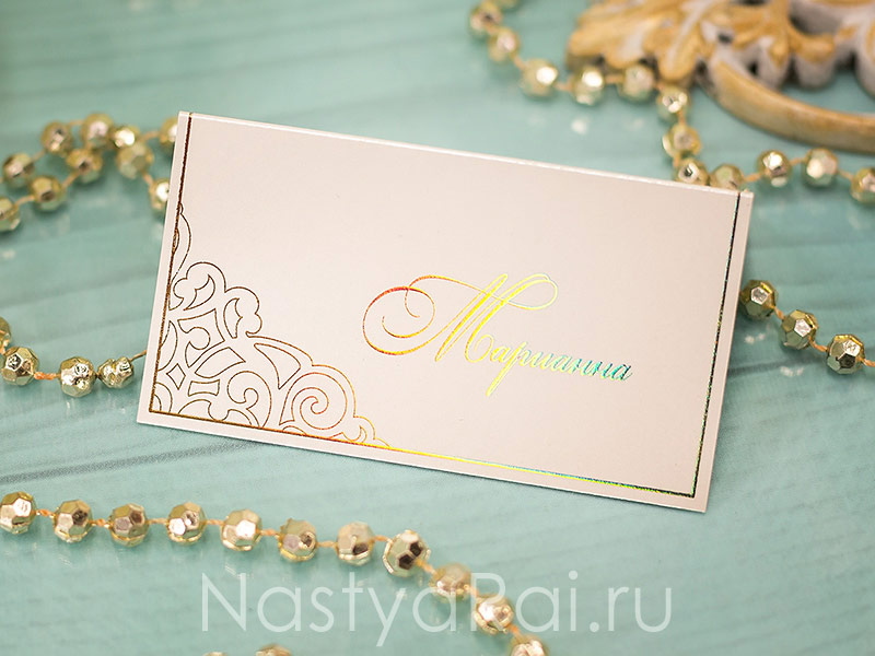 Рассадочная карточка из перламутровой дизайнерской бумаги с узором, который переливается золотом с голографическим эффектом. Узор двухсторонний.