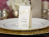 Рассадочная карточка с именем гостя из мерцающей дизайнерской бумаги. Декорирована атласной лентой.