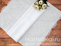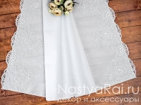 Свадебный рушник с серебряным люрексом выполнен из габардиновой ткани. Края рушника украшает широкое кружево с цветочными мотивами. Рушник можно использовать для обряда венчания и для встречи жениха и невесты с хлебом и солью после ЗАГСа или храма. Ручная работа.
