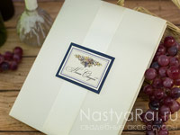 Лаконичная папка, обтянутая кремовой тканью, декорирована атласной лентой цвета айвори и объемной карточкой с цветочным рисунком и темно-синей рамкой и подложкой.