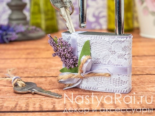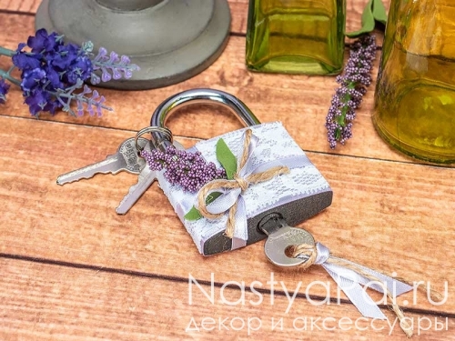 Свадебный замок «Прованс» выполнен в элегантном французском стиле! Замочек украшен лиловой атласной лентой с белым кружевом, сверху закреплена нежная веточка лаванды с зелеными листочками. В комплект с замочком включены три ключа — символы нерушимости семейного союза!