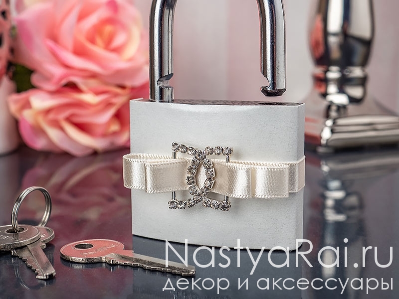 Свадебный замочек «Шанель» — воплощение французской элегантности! Замок декорирован гладкой атласной лентой и двойным плоским бантиком айвори. Сверху расположен сверкающий логотип из страз. В набор включены два серебряных ключа.