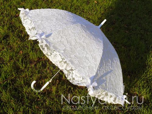 Белый нейлоновый зонт украшен итальянским кружевом, по уголкам спиц - атласные бантики. Зонтик прекрасно защитит от дождя, снега и солнца.