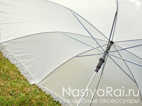 Белый зонтик из водонепроницаемой ткани, украшенный кружевом и бантами прекрасно защитит от дождя, снега или солнца, а также станет прекрасным дополнением свадебного образа невесты.