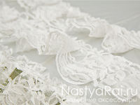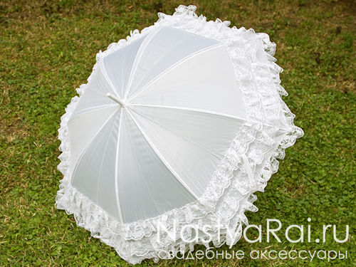 Белый нейлоновый зонт украшен тремя рядами белого кружева. Зонтик прекрасно защитит от дождя, снега и солнца.