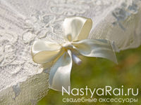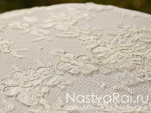Зонтик украшенный итальянским кружевом и бантами цвета айвори прекрасно защитит от дождя, снега или солнца.